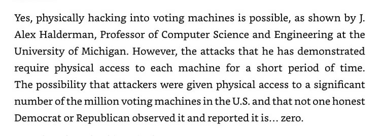He explains that he could write code that would be undetectable. However, at one point he confirms that the fraud could be detected by hand counting the votes and comparing it to the machine totals. The problem with this testimony is that hand counting ballots IS REQUIRED as part of the audit that takes place after each election. As noted in Thinking Critically About 2020 Stolen Election Claims, "3,077 Post election county audits did not discover any vote flipping scheme. That includes the 509 audits in the swing states that were won by Biden"